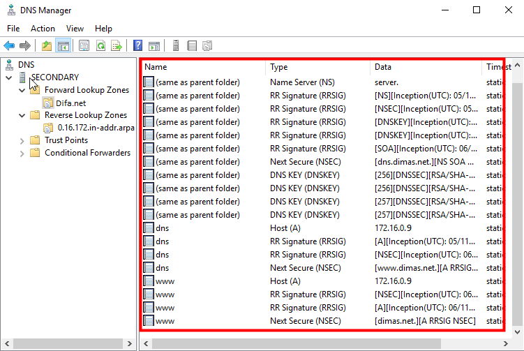 16. Ketika sudah selesai mensetting transfer di Server Primary, kita kembali ke Server Secondary dan lakukan refresh di masing-masing tab (Forward & Reverse lookup zone) untuk memastikan bahwa data yang ada di Primary sudah di transfer ke Secondary.